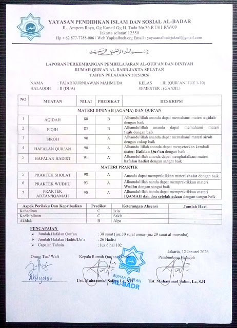 Dokumentasi Rumah Qur’an Al Badr, arsip lembar raport perkembangan belajar santri semester gasal, Januari 2026