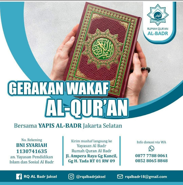 Semoga amal sedekah waqaf Al Qur’an senantiasa berkembang dan bermanfaat bagi seluruh kaum muslimin, dan dengan sendirinya semoga pula akan menjadi catatan amal jariyah di sisi Allah Subhanahu wa Ta’alaa.